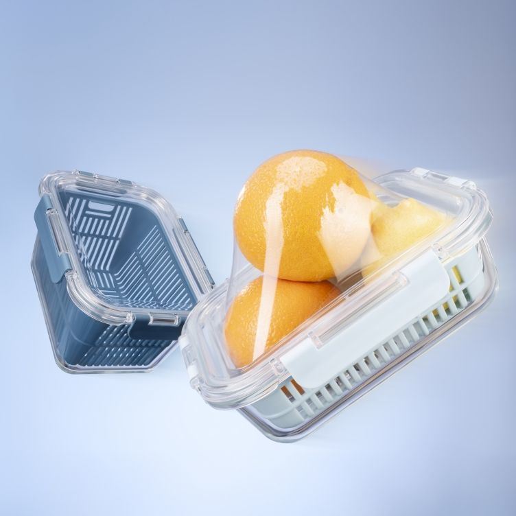 A: It includes a PP colander basket for washing, draining, and storing food in the same container, paired with a flexible, airtight silicone lid.