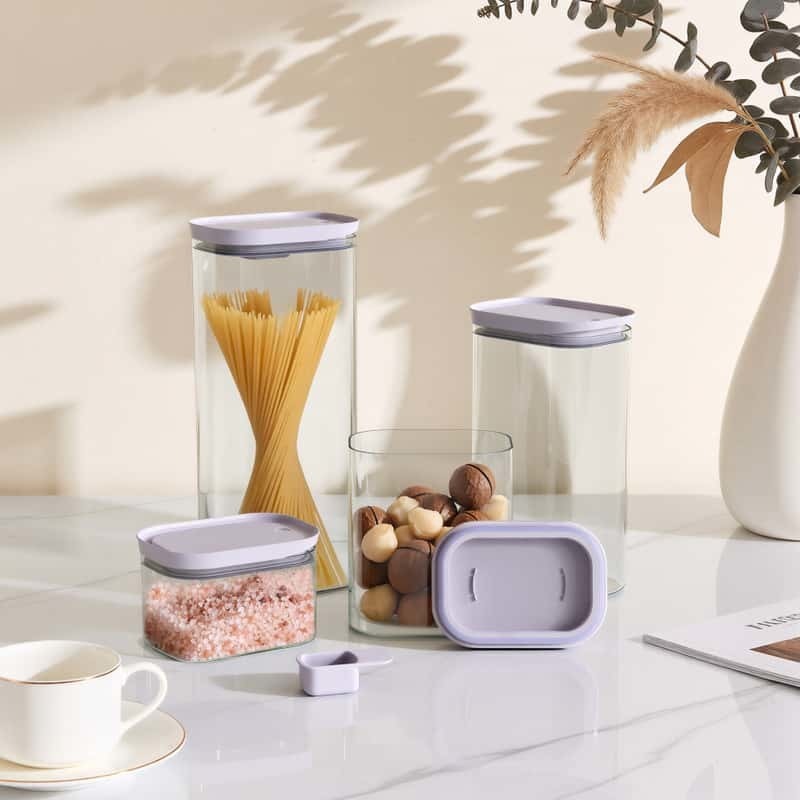 Stackable lids keep countertop storage neat.